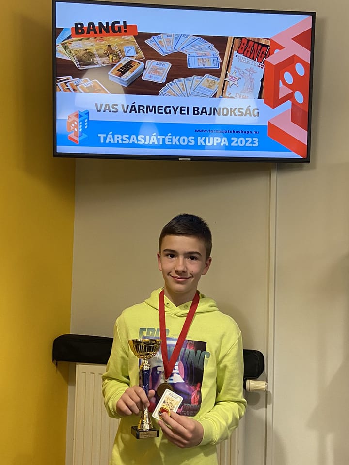 Örömmel gratulálunk Cseresnyés Dániel 7. b osztályos tanulónak, aki a Társasjátékos Kupa Vas vármegyei Bajnokságán a BANG! játékban 1. helyezést ért el. Ezzel lehetőséget kapott, hogy részt vegyen a Budapesten megrendezésre kerülő Országos Bajnokságon is.