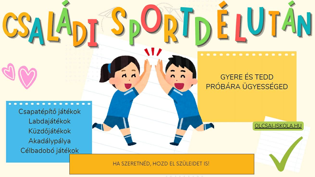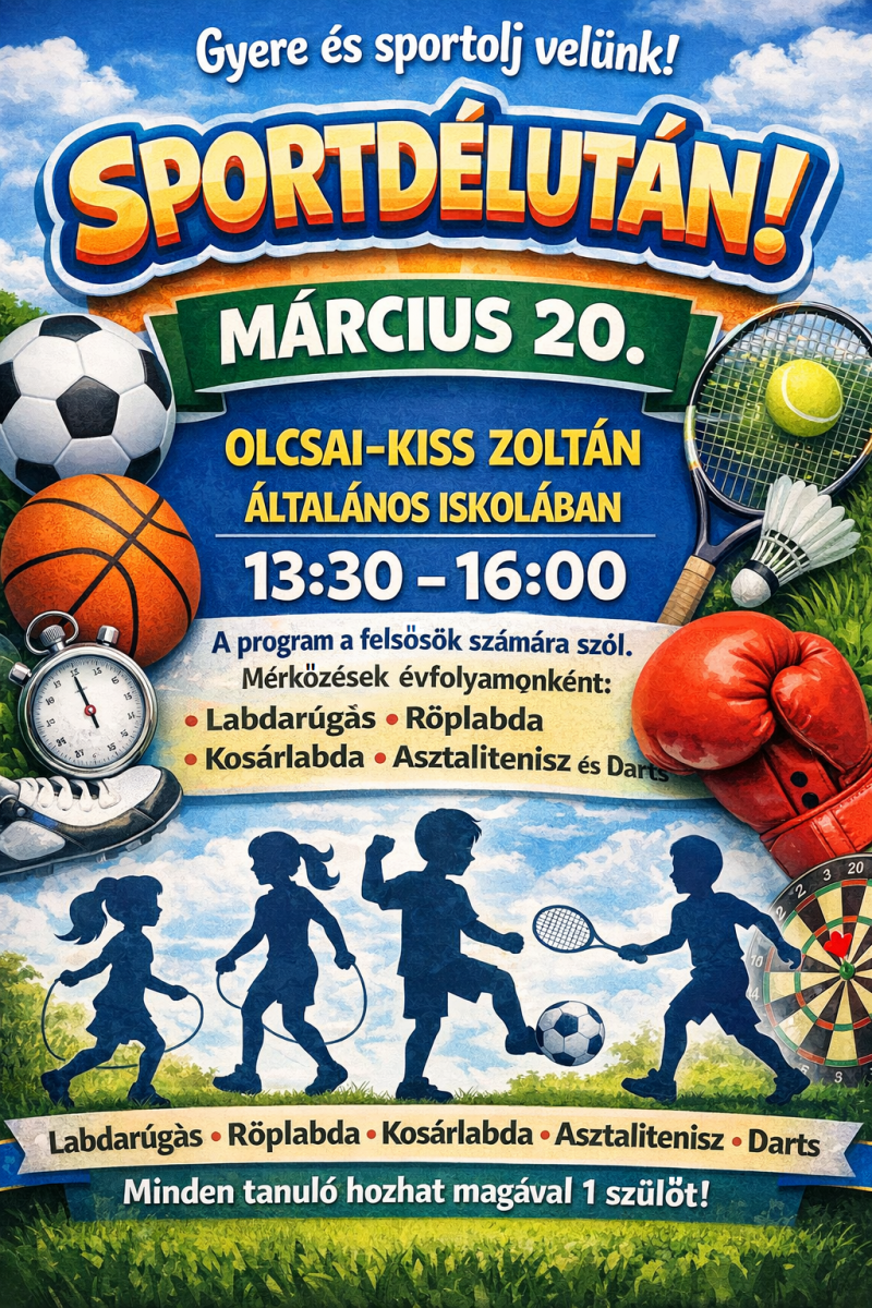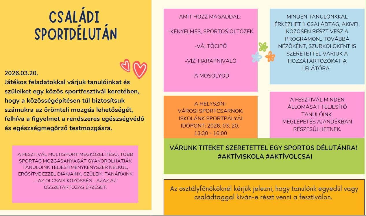 Híreink Mozduljunk együtt! – Családi Sportkaland az Olcsaiban 2026. március 18., szerda felsősöknek.... Vissza Megosztás