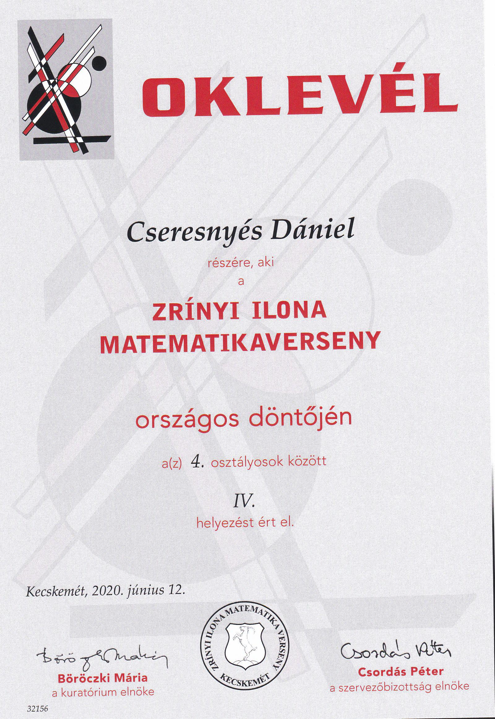 Az Olcsai iskola 4. évfolyamos tanulója március elején vehette át a Zrínyi Ilona matematika vereseny megyei 1. helyezettjének járó díjat, és egyben egy meghívó levelet, mely az osszágos döntőre szólt. Dani digitális tanrend alatt is folytatta a felkészülést tanítójával Papné Bizderi Hajnalkával. A napokban zajlottak le a döntő fordulói. Dani az országos rangsorban a 4. helyezést érte el. Nagyon büszkék vagyunk tanulónkra! Gratulálunk a szép teljesítményhez, az országos 4. helyezéshez.