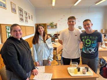 Ha november, akkor középpontban az egészségnevelés. Így volt ez a mi iskolánkban is. A felső tagozatosok kiemelkedően magas számban vettek részt a vetélkedőn. Szükség volt előzetes ismereteikre, de új tudást is szerezhettek a kísérletezések során. A délután a kézmosás szabályainak alkalmazásával kezdődött. Immár tiszta kézzel kezdődhetett a sok izgalmas kutatás és játékos feladat. A gyerekek többek közt vizsgálták a só vízelvonó képességét, a tejfölök „eredetiségét”, illetve mesterséges sűrítésük mértékét. Számos fűszernövény is rendelkezésre állt, melyeket kezükbe foghattak és internetes böngészéssel megkereshették gyógyító hatásukat. Az egyik legérdekesebb feladat az általuk is gyakran fogyasztott italok cukortartalmának megsaccolása volt. Meglepő eredményre jutottak: jóval több cukrot visznek be a szervezetünkbe, mint amennyit gondolnának. A délután zárásaként levonták a tanulságot: ha figyelnek az ételek minőségére, számos betegséget megelőzhetnek.