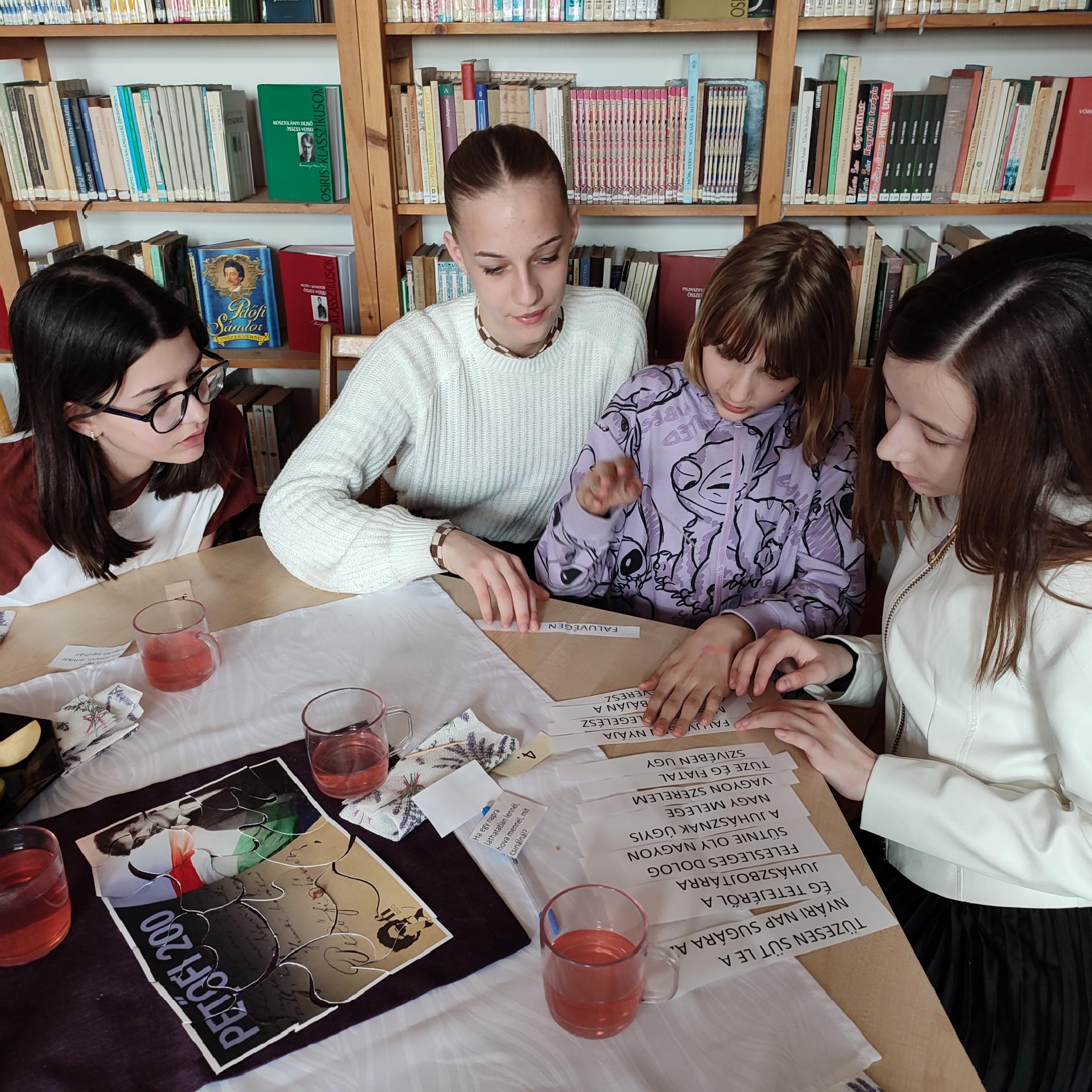 humoros meséjét, majd Hegedűs Janka érzelemteli előadásában hallgathattuk meg a pályázatra beküldött díjnyertes versét. Délután az Olcsai iskola könyvtárában folytattuk a közös irodalmi programunkat. Az irodalmi kávéház idén itt volt: Kovács-Nemes Erzsébet könyvtáros díszletei, a 7. évfolyam magyarszakköröseinek saját készítésű süteményei, zenei anyaga annak a 16 résztvevőnek varázsolt bensőséges hangulatot, akik erre a programra jöttek el. Véletlenszerűen kialakított vegyes csoportokban tevékenykedtek a két iskola felső tagozatos tanulói. Játékos feladataikat a Petőfi-emlékév jegyében oldották meg: életrajzi totó, kínrím-írás, versillusztráció, Petőfi-puzzle, még egy kis matematikai fejtörő is szerepelt köztük. Ezen a helyszínen is készült irodalmi műsor: Virág László gitározott, illetve az Olcsai iskola hetedikeseinek Petőfi- versátiratait harmadik osztályos társaik- Agg Levente, Cserfalvi Kornél, Rozmán Anna és Somogyi Botond- adták elő a kávéház hallgatóságának. A forrócsoki kortyolgatás után mind a négy csapat tagjait megajándékoztuk, és ezzel zártuk az egésznapos irodalmi programot. Elsősorban köszönjük az intézményvezető asszonynak, Fazekasné Mittli Piroskának, hogy támogatta- részvételével is- mindkét helyszínen a rendezvényt. Biczó Beáta tanárnőnek azt, hogy a költészet világnapi programot tavaly elindította és idén is megszervezte. Mindkét iskola diákönkormányzatának az anyagi támogatást. A diákok aktív szervezőmunkáját a fent felsoroltakon kívül: Horváth Emmának, Kánya Flórának, Koltay Fanninak, Péter Lucának, Simon Alexnak és Takács Pankának. A könyvtárosaink és tanáraink segítségét: Bognárné Kecskés Líviának, Kondorné Karvalics Gabriellának, Kovács- Nemes Erzsébetnek és Eredics Évának.