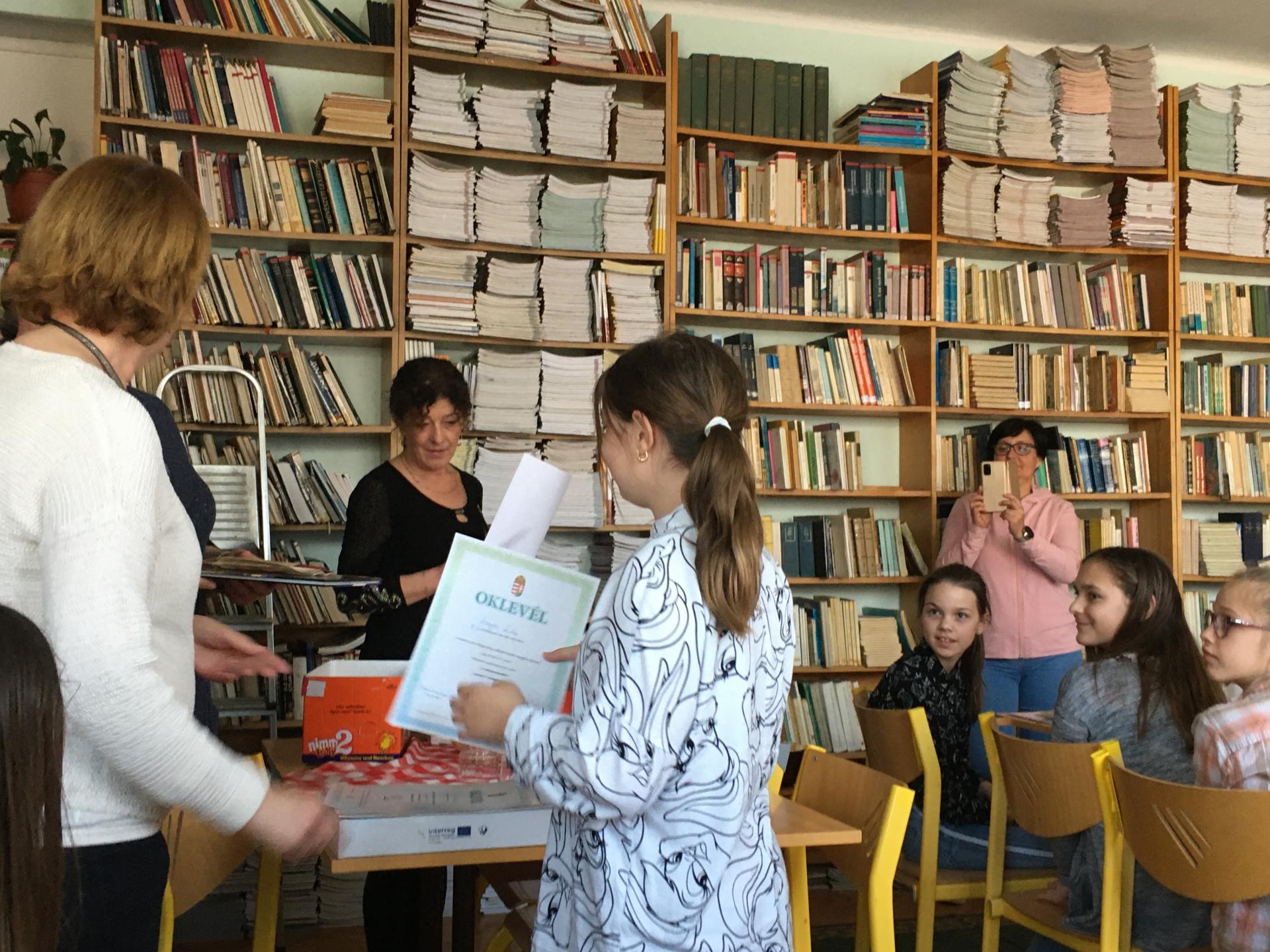 Délelőtt egy különleges eredményhirdetésen vehették részt tanulóink a Somogyi iskola könyvtárában. Megterített asztaloknál hallgathatták meg az irodalmi pályázat értékelését Biczó Beáta tanárnőtől, aki a költészet világnapi program főszervezője volt. Nemcsak a vers, mese- és novellaírópályázat helyezettjei részesültek elismerésben, hanem minden pályázó diák jutalmat vehetett át, és az igazi meglepetés az volt, hogy könyv készült mindkét iskola könyvtárának valamennyi beküldött irodalmi alkotásból. Így az érdeklődő diáktársak és a tanárok elolvashatják azokat. A helyezett pályaművek pedig hamarosan a Somogyi iskola digitális suliújságjában és az Olcsai iskola honlapján is elérhetőek lesznek.