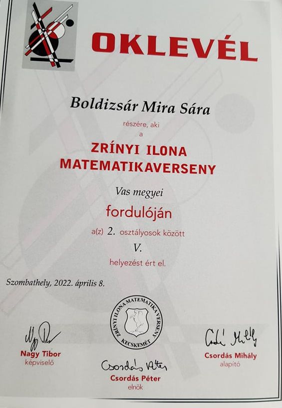 A legfiatalabb tanulónk Boldizsár Míra Sára élete első versenyén 5. helyezést ért el. Mírának Czimber Miklósné Ági néni tanítja a matematikát.