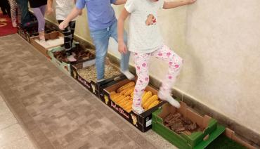 A nap egyik legizgalmasabb élménye a mezítlábas érzékelő volt: a gyerekek bátran léptek végig gesztenyén, kukoricán, tobozon, kavicson, fakérgen, felfedezve, milyen sokféle arcát mutatja az ősz a tapintás révén. A jókedvet csak fokozta a közös mondókázás, amelyben a gyerekek hangosan, ritmusosan, diót kopogtatva idézték meg az évszak játékos dallamait.