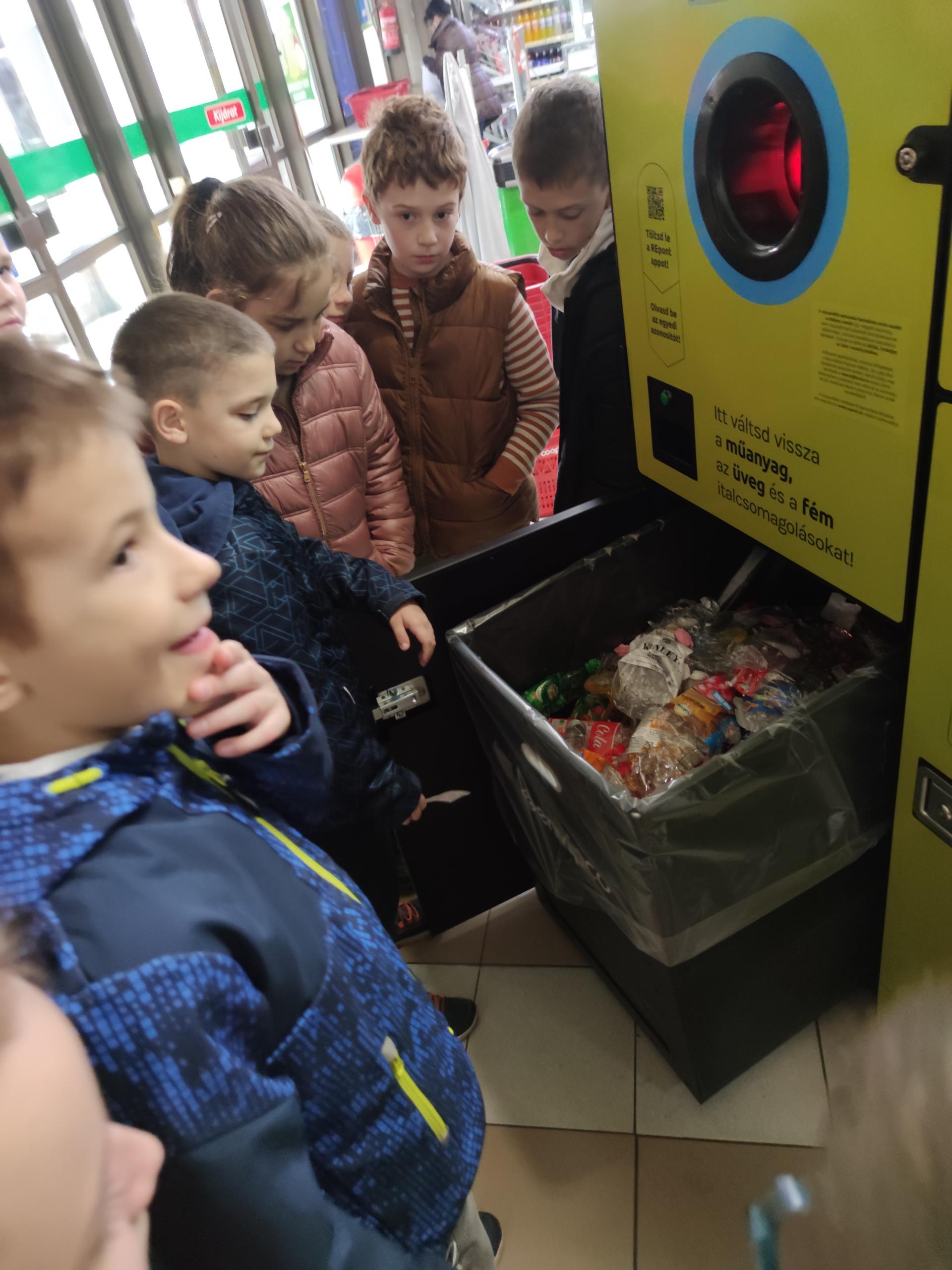 A gyerekek lelkesen gyűjtötték a visszaváltható flakonokat, amiket aztán közösen vittünk el egy Re-pontra. Megnézhettük a visszaváltó automata működését belülről is, hogyan különíti el az üvegeket, hogyan tömöríti össze a műanyag flakonokat. Büszkén tértünk vissza az iskolába a visszaváltásért kapott kuponokkal.