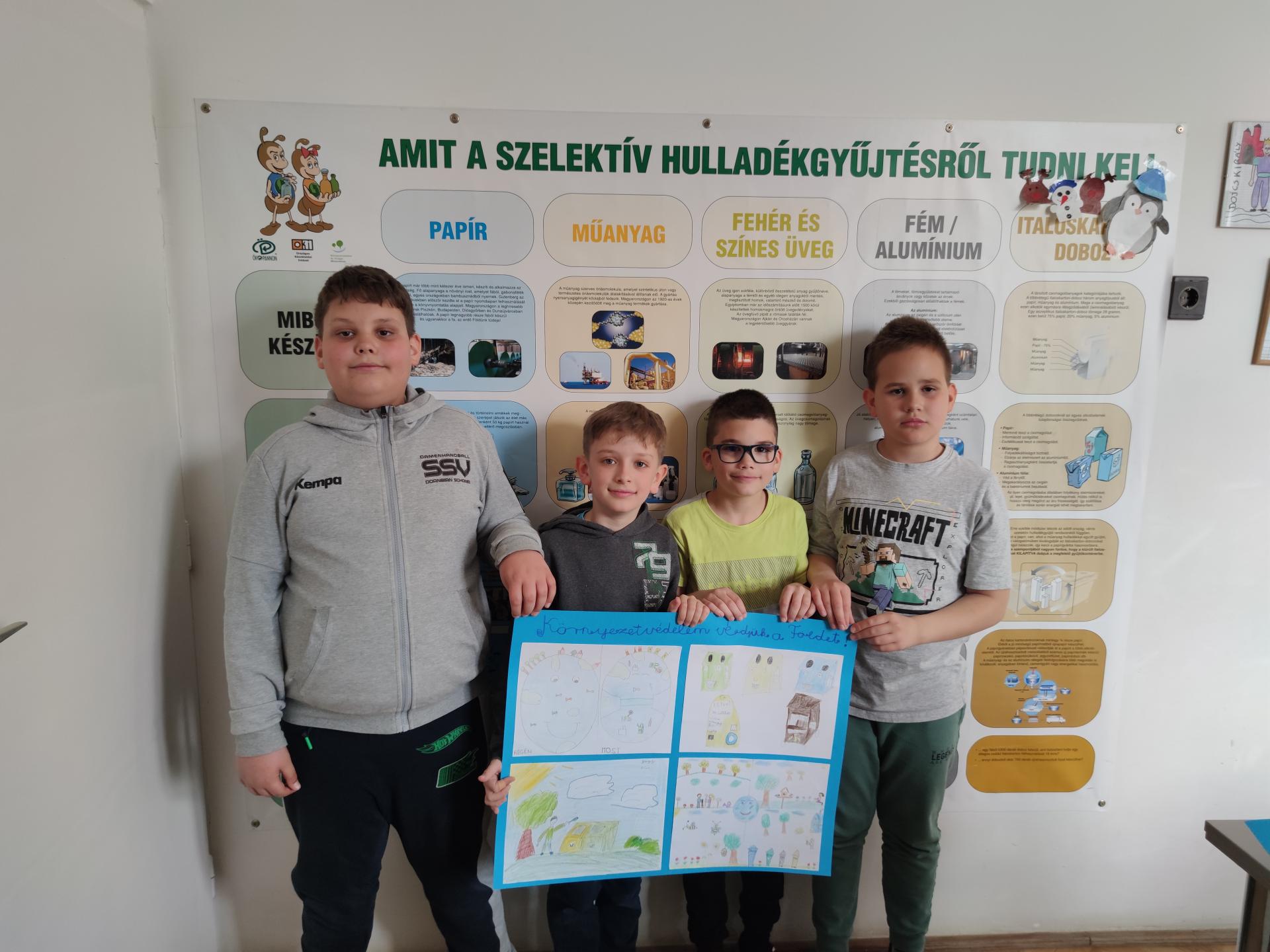 Ezután a gyerekek témával kapcsolatos rajzaiból és cselekvésre ösztönző felirataiból tablókat készítettünk. A rajzok és feliratok kitértek például a talaj, a levegő, a víz védelmére; a növény-és állatvilág fontosságára; a szelektív hulladékgyűjtésre; a takarékosságra; az újrahasznosításra és környezetünk szépítésére is. Praktikus tanácsok is felkerültek a tablókra, úgymint: „Öntözz esővízből!”, „Ültess fákat!”. Végül néhány tárgyat is készítettünk újrahasznosított anyagokból.