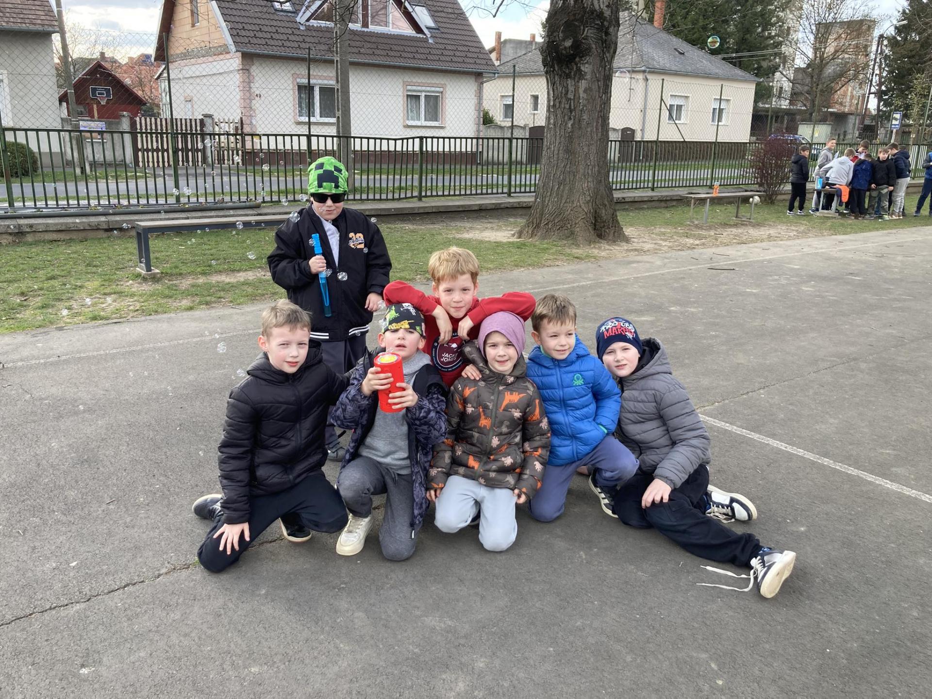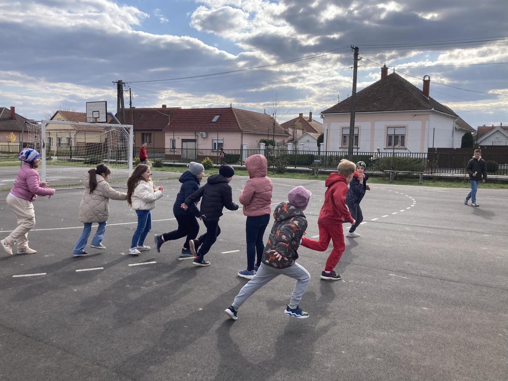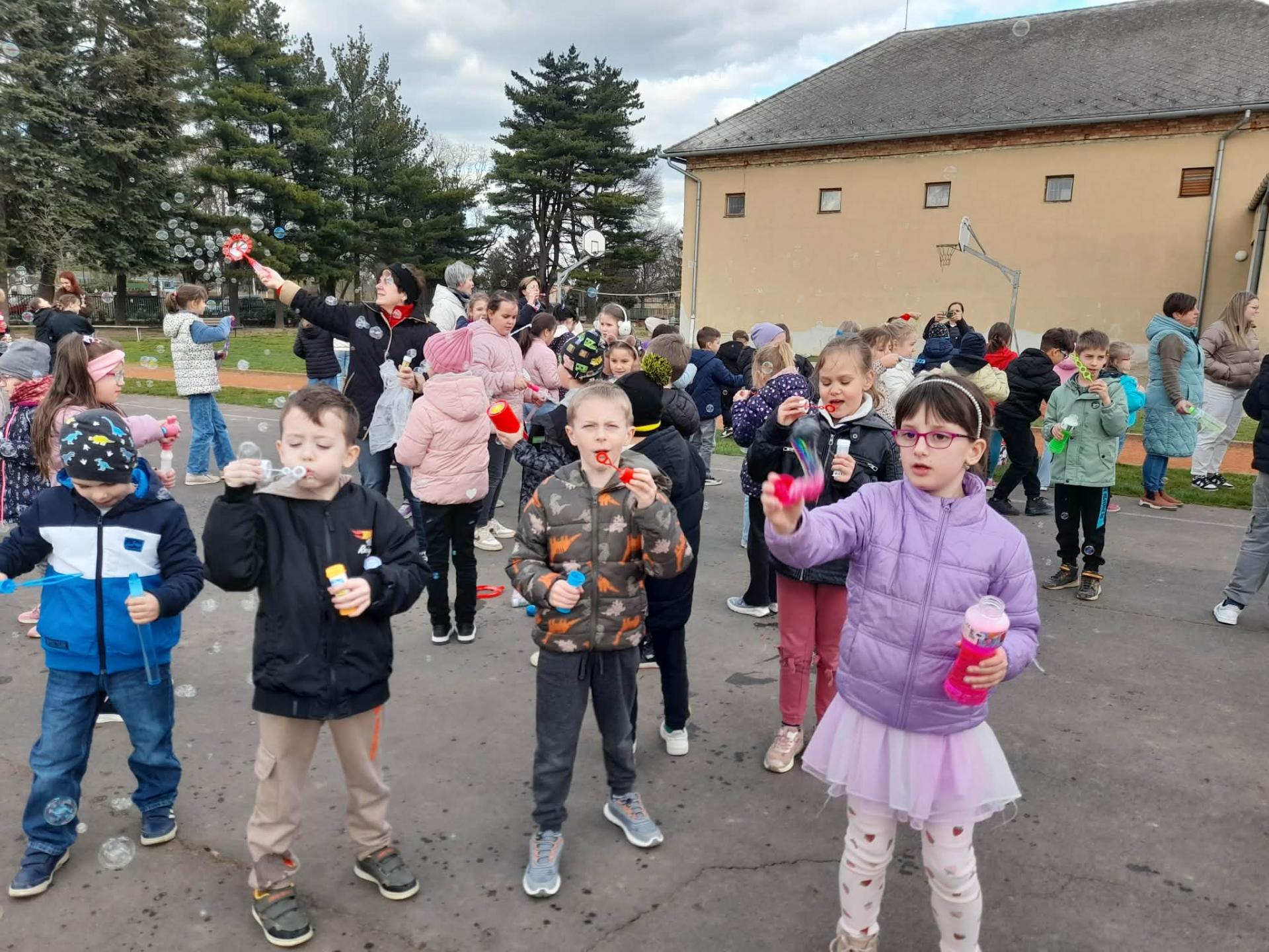 A program második fele az udvaron zajlott, ahol buborékfújásra hívtuk a gyerekeket egy kis zenével. Hamarosan buborékok százai szálltak a magasba egyszerre, miközben a gyerekek megpróbálták elkapni őket.