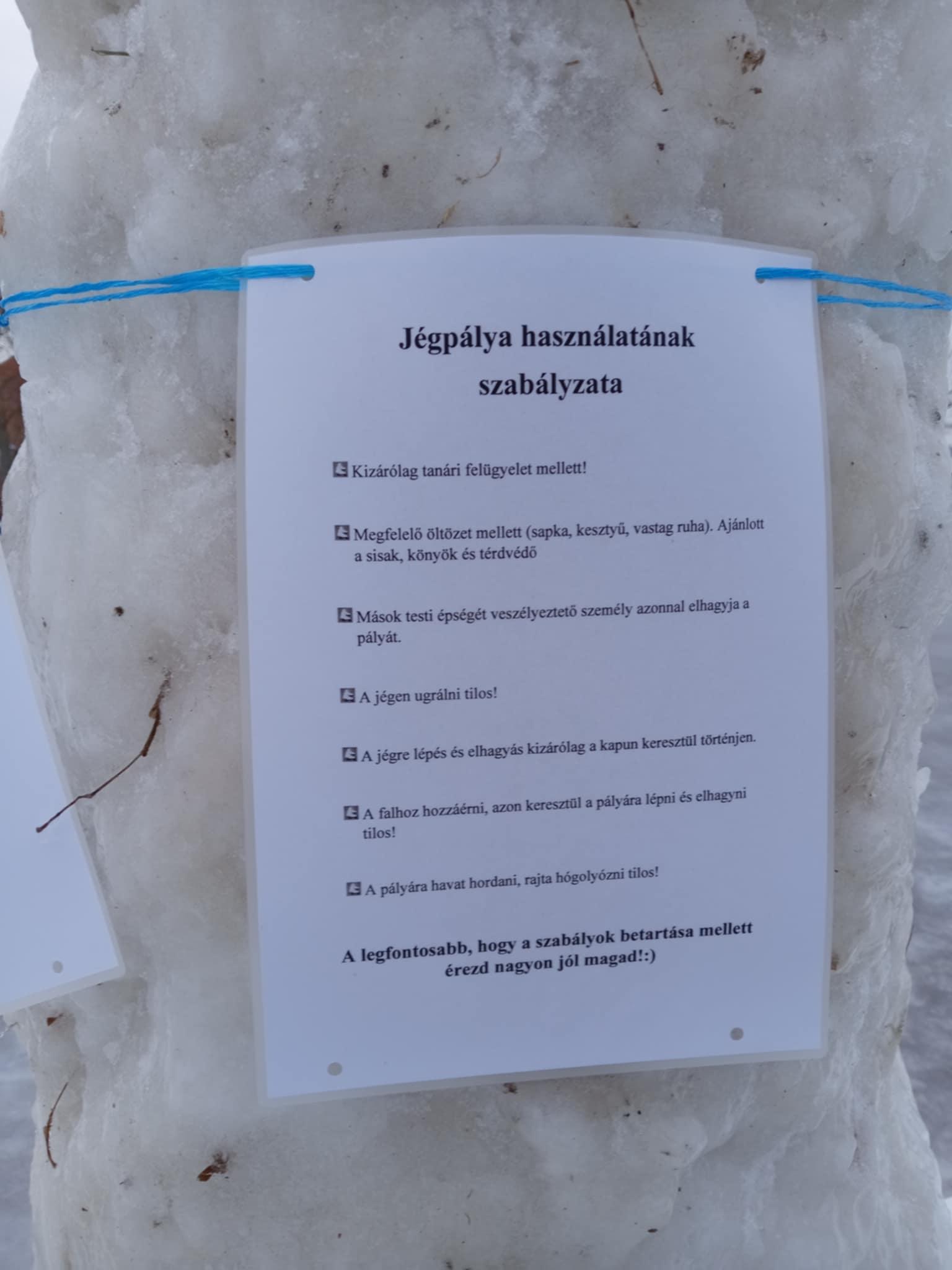 A tartósan hideg időjárás lehetőséget teremtett arra, hogy hosszú idő után újra jégpályát varázsoljunk iskolánk udvarára. Az ötlet és a megvalósítás a testnevelőinknek és karbantartónknak köszönhető, különösen Bátorfi Kristóf, Petrovics Bálint Gombás Szabolcs kollégáinknak. Reméljük, hogy tanulóink a szabályok betartása mellett örömmel használják.