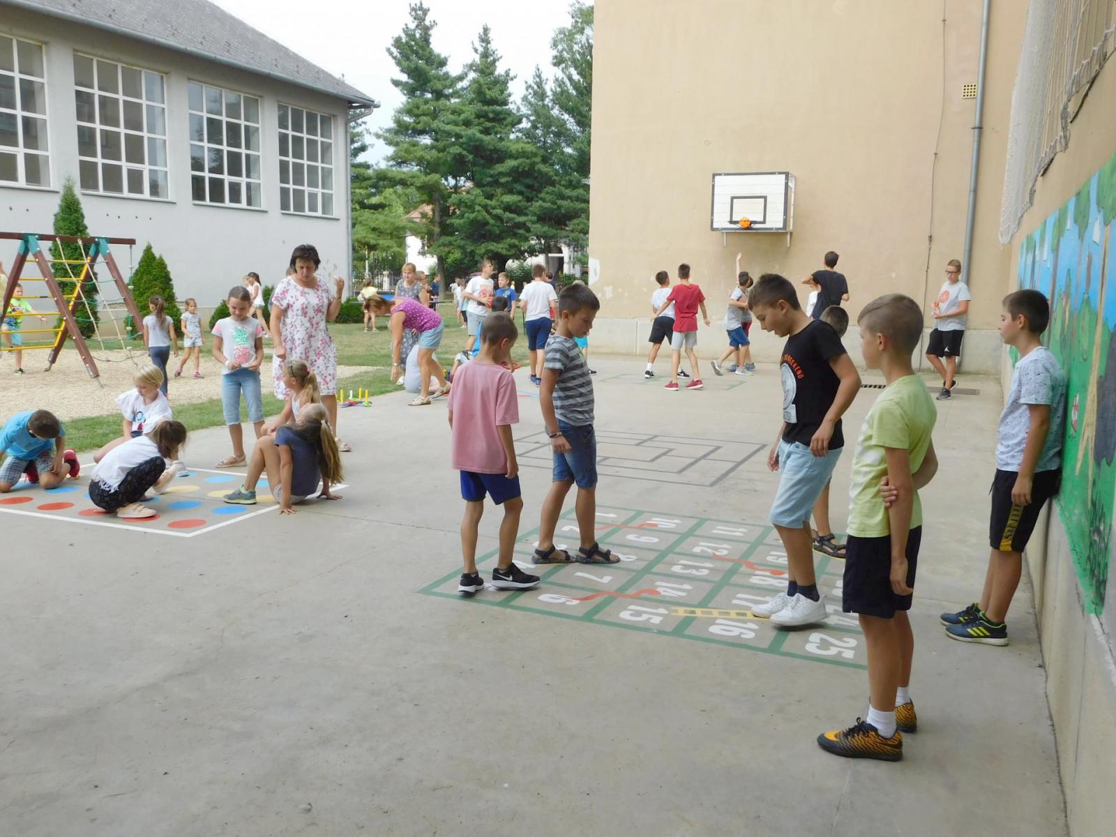 Tágas udvarunk sportolásra, játékra, kikapcsolódásra egyaránt alkalmas. Közvetlen szomszédságunkban van a városi uszoda, melyet hamarosan ismét bírtokba vehetnek diákjaink.